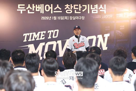 [스포티비뉴스=잠실, 곽혜미 기자] 2026 두산 창단기념식이 15일 오전 서울 송파구 잠실야구장에서 열렸다. 두산 김원형 감독이 인사말을 하고 있다.