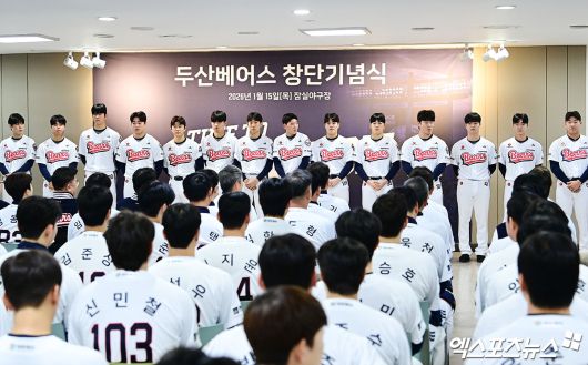(엑스포츠뉴스 잠실, 박지영 기자) 15일 오전 서울 송파구 잠실야구장에서 열린 '2026 두산 베어스 창단 기념식'에 참석한 2026 신인 선수들이 인사하고 있다.박지영 기자 jypark@xportsnews.com