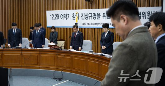 (서울=뉴스1) 유승관 기자 = 이양수 국회 12.29 여객기 참사 진상규명을 위한 국정조사특별위원회 위원장을 비롯한 여야 위원들이 15일 서울 여의도 국회에서 열린 제431회 국회(임시회) 12.29 여객기 참사 진상규명을 위한 국정조사특별위원회 제3차 전체회의에 앞서 묵념하고 있다. 2026.1.15/뉴스1