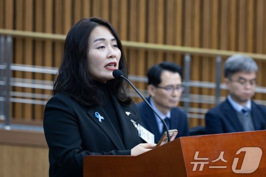 (서울=뉴스1) 유승관 기자 = 김유진 12·29 무안공항 제주항공 여객기 참사 유가족협의회 대표가 15일 서울 여의도 국회에서 열린 제431회 국회(임시회) 12.29 여객기 참사 진상규명을 위한 국정조사특별위원회 제3차 전체회의에서 발언하고 있다. 2026.1.15/뉴스1