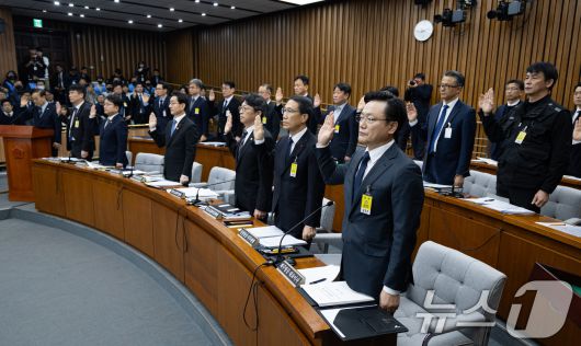 (서울=뉴스1) 유승관 기자 = 김이배 제주항공 대표(앞줄 오른쪽)를 비롯한 증인들이 15일 서울 여의도 국회에서 열린 제431회 국회(임시회) 12.29 여객기 참사 진상규명을 위한 국정조사특별위원회 제3차 전체회의에서 증인 선서를 하고 있다. 2026.1.15/뉴스1