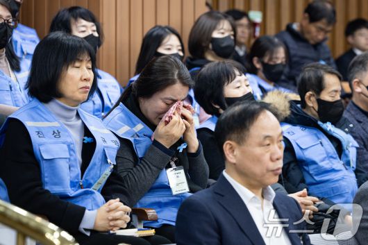 (서울=뉴스1) 유승관 기자 = 12·29 무안공항 제주항공 여객기 참사 유가족이 15일 서울 여의도 국회에서 열린 제431회 국회(임시회) 12.29 여객기 참사 진상규명을 위한 국정조사특별위원회 제3차 전체회의에서 눈물을 훔치고 있다. 2026.1.15/뉴스1