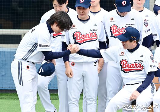 (엑스포츠뉴스 잠실, 박지영 기자) 15일 오전 서울 송파구 잠실야구장에서 열린 '2026 두산 베어스 창단 기념식'에 참석한 박찬호가 전형도 코치와 악수를 나누고 있다.박지영 기자 jypark@xportsnews.com