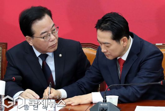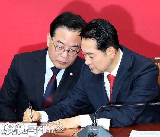 (서울=국제뉴스) 장동혁 국민의힘 대표가 15일 오전 서울 여의도 국회에서 열린 최고위원회의에서 송언석 원내대표와 대화하고 있다./사진=이용우 기자