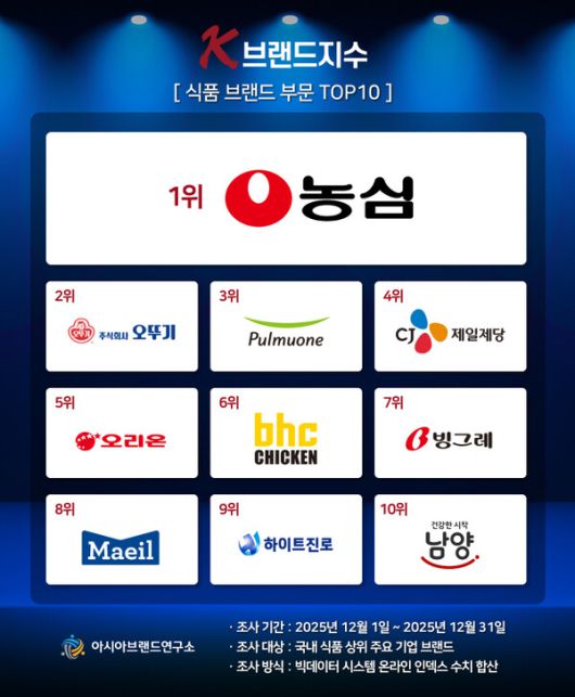 이번 K-브랜드지수 식품 브랜드 부문은 국내 식품 상위 주요 기업 브랜드를 대상으로, 2025년 12월 1일부터 12월 31일까지의 온라인 빅데이터 4326만 6613건을 분석했다.