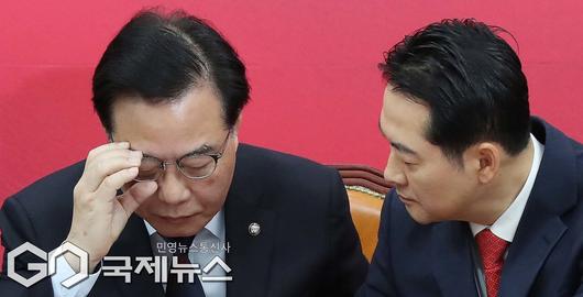 (서울=국제뉴스) 장동혁 국민의힘 대표가 15일 오전 서울 여의도 국회에서 열린 최고위원회의에서 송언석 원내대표와 대화하고 있다./사진=이용우 기자