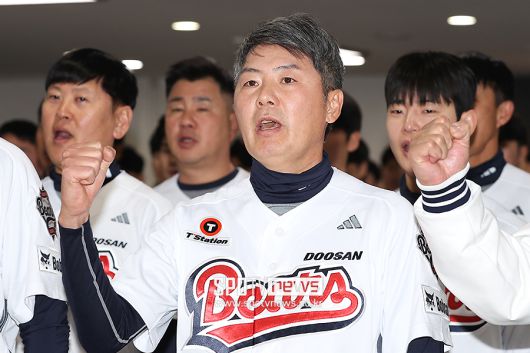 [스포티비뉴스=잠실, 곽혜미 기자] 2026 두산 창단기념식이 15일 오전 서울 송파구 잠실야구장에서 열렸다. 두산 김원형 감독이 파이팅을 외치고 있다. <저작권자 ⓒ SPOTV NEWS. 무단전재 및 재배포 금지>