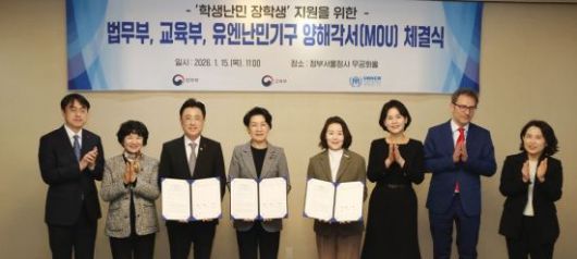 이진수 법무부 차관(왼쪽 세번째), 최은옥 교육부 차관(왼쪽 네번째), 김새려 유엔난민기구 한국대표부 대표(오른쪽 네번째) 등 참석자들이 15일 서울 종로구 정부서울청사에서 열린 학생난민 장학생 지원을 위한 법무부-교육부-유엔난민기구 양해각서 체결식에서 기념촬영을 하고 있다. <ⓒ투자가를 위한 경제콘텐츠 플랫폼, 아시아경제(www.asiae.co.kr) 무단전재 배포금지>