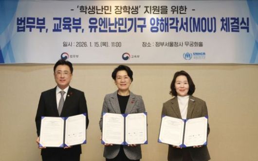 이진수 법무부 차관(왼쪽부터), 최은옥 교육부 차관, 김새려 유엔난민기구 한국대표부 대표가 15일 서울 종로구 정부서울청사에서 열린 학생난민 장학생 지원을 위한 법무부-교육부-유엔난민기구 양해각서 체결식에서 협약서를 들고 기념촬영을 하고 있다. <ⓒ투자가를 위한 경제콘텐츠 플랫폼, 아시아경제(www.asiae.co.kr) 무단전재 배포금지>