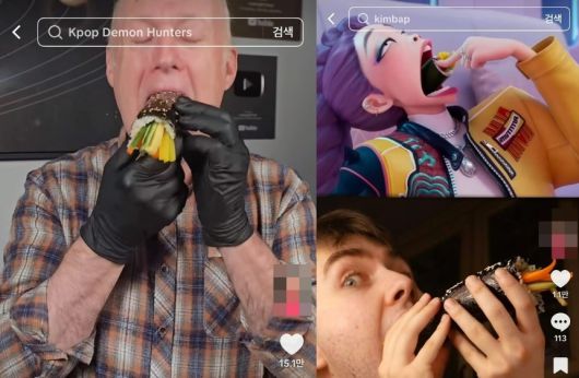 지난해 폭발적인 인기를 끈 애니메이션 케이팝데몬헌터스(우측 상단)에서 김밥을 먹는 장면이 나오며 SNS에 ‘김밥 먹기 챌린지’가 유행으로 번진 바 있다. |