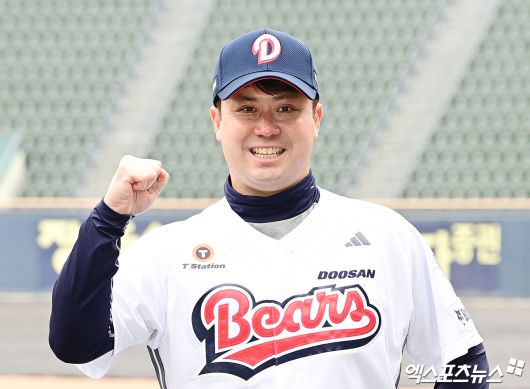 (엑스포츠뉴스 잠실, 박지영 기자) 15일 오전 서울 송파구 잠실야구장에서 열린 '2026 두산 베어스 창단 기념식'에 참석한 손지환 코치가 그라운드에서 기념 촬영을 하고 있다.박지영 기자 jypark@xportsnews.com