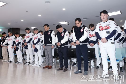 [스포츠투데이 권광일 기자] 15일 서울 잠실야구장에서 열린 두산 베어스 시무식에서 두산 선수단이 故 김민재 추모 묵념을 하고 있다. 2026.01.15. [스포츠투데이 권광일 기자 sports@stoo.com]