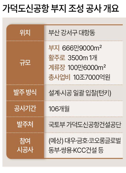 공사기간(공기) 갈등으로 표류했던 가덕도신공항 사업이 재개된다. 대우건설을 중심으로 공항 건설 경험을 보유한 시공사들이 공동수급체(컨소시엄)를 구성해 입찰에 돌입하면서다. 정부는 올해 하반기에 가덕도신공항 부지 착공을 마치겠다는 방침이다.