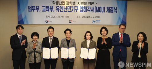 [서울=뉴스핌] 이길동 기자 = 이진수 법무부 차관, 최은옥 교육부 차관, 김새려 유엔난민기구 한국대표부 대표 등 참석자들이 15일 서울 종로구 정부서울청사에서 열린 학생난민 장학생 지원을 위한 법무부-교육부-유엔난민기구 양해각서 체결식에서 기념촬영을 하고 있다.2026.01.15 gdlee@newspim.com |