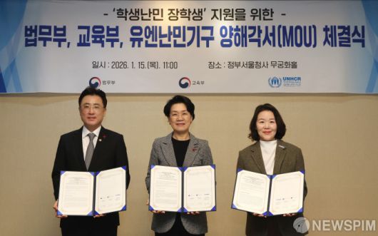 [서울=뉴스핌] 이길동 기자 = 이진수 법무부 차관(왼쪽부터), 최은옥 교육부 차관, 김새려 유엔난민기구 한국대표부 대표가 15일 서울 종로구 정부서울청사에서 열린 학생난민 장학생 지원을 위한 법무부-교육부-유엔난민기구 양해각서 체결식에서 협약서를 들고 기념촬영을 하고 있다.2026.01.15 gdlee@newspim.com |