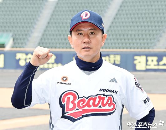 (엑스포츠뉴스 잠실, 박지영 기자) 15일 오전 서울 송파구 잠실야구장에서 열린 '2026 두산 베어스 창단 기념식'에 참석한 손시헌 코치가 그라운드에서 기념 촬영을 하고 있다.박지영 기자 jypark@xportsnews.com
