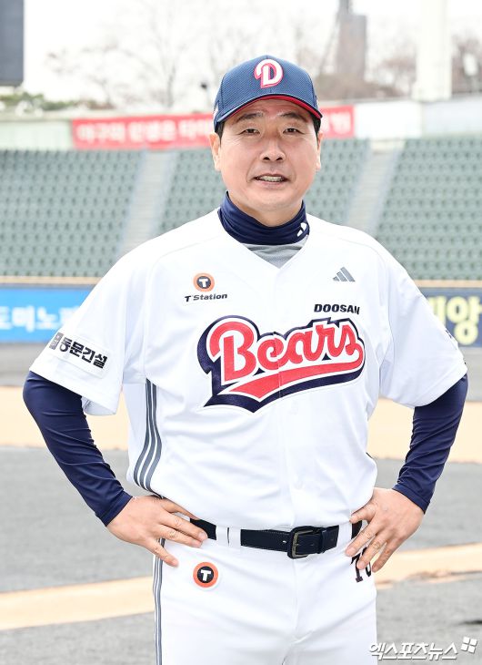 (엑스포츠뉴스 잠실, 박지영 기자) 15일 오전 서울 송파구 잠실야구장에서 열린 '2026 두산 베어스 창단 기념식'에 참석한 홍원기 수석코치가 그라운드에서 기념 촬영을 하고 있다.박지영 기자 jypark@xportsnews.com