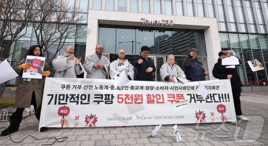 (서울=뉴스1) 김성진 기자 = 안전한 쿠팡 만들기 공동행동 관계자들이 15일 서울 송파구 쿠팡 본사 앞에서 열린 쿠팡 탈퇴, 쿠팡 쿠폰 거부 선언 기자회견에서 쿠팡 5천원 할인쿠폰을 찢는 퍼포먼스를 하고 있다. 2026.1.15/뉴스1ssaji@news1.krCopyright ⓒ 뉴스1. All rights reserved. 무단 전재 및 재배포, AI학습 이용 금지.