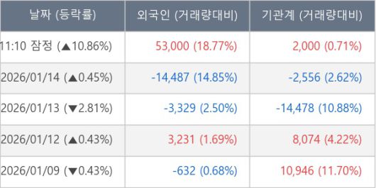 [서울=뉴스핌] 로보뉴스 = 15일 11시 30분 현재 노머스(473980)는 외국인과 기관이 각각 5.30 만 주, 0.20 만 주 순매수(잠정) 하면서 전일 대비 10.86% (현재가 25,000원) 상승하고 있다.