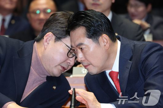 (서울=뉴스1) 신웅수 기자 = 장동혁 국민의힘 대표와 신동욱 최고위원이 15일 서울 여의도 국회에서 열린 의원총회에서 대화하고 있다. 2026.1.15/뉴스1phonalist@news1.krCopyright ⓒ 뉴스1. All rights reserved. 무단 전재 및 재배포, AI학습 이용 금지.