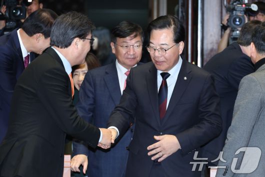 (서울=뉴스1) 신웅수 기자 = 송언석 국민의힘 원내대표가 15일 서울 여의도 국회에서 열린 의원총회에서 김대식 의원과 인사하고 있다. 2026.1.15/뉴스1phonalist@news1.krCopyright ⓒ 뉴스1. All rights reserved. 무단 전재 및 재배포, AI학습 이용 금지.