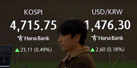 14일 서울 중구 하나은행 본점 딜링룸에서 직원이 증시와 환율을 살펴보고 있다. 코스피는 7.53p(0.16%) 내린 4,685.11로 개장했지만 장중 사상 첫 4,700선을 돌파했다. 이상섭 기자 |