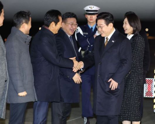 일본 방문 일정을 마치고 귀국한 이재명 대통령이 14일 성남 서울공항에서 더불어민주당 정청래 대표와 인사하고 있다. 연합뉴스 |