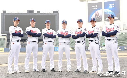 (엑스포츠뉴스 잠실, 박지영 기자) 15일 오전 서울 송파구 잠실야구장에서 열린 '2026 두산 베어스 창단 기념식'에 참석한 안민겸, 정성헌, 최주형, 서준오, 이주호, 임종훈, 안치호가 그라운드에서 기념 촬영을 하고 있다.박지영 기자 jypark@xportsnews.com
