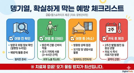의료계의 한 관계자는 "뎅기열은 철저한 예방만이 최선의 해결책"이라며 "해외여행 전 질병관리청 홈페이지를 통해 방문 국가의 감염병 발생 정보를 미리 확인하는 습관이 필요하며 귀국 후에도 자신의 건강 상태를 면밀히 살피는 책임감 있는 태도가 자신과 가족의 안전을 지키는 첫걸음이 될 것"이라고 강조했다.