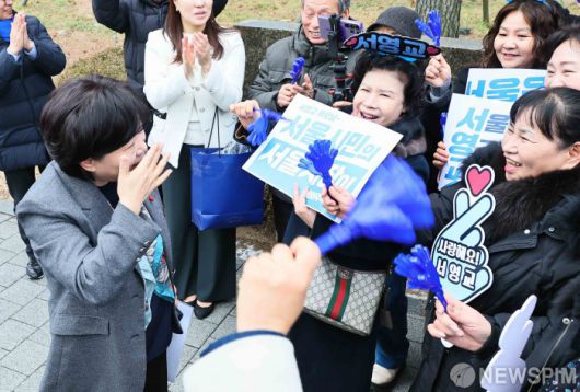 [서울=뉴스핌] 윤창빈 기자 = 서영교 더불어민주당 의원이 15일 서울 여의도 국회에서 6.3 지방선거 서울시장 출마 선언을 하기 위해 들어서며 지지자들의 응원을 받자 눈물을 훔치고 있다. 2026.01.15 pangbin@newspim.com