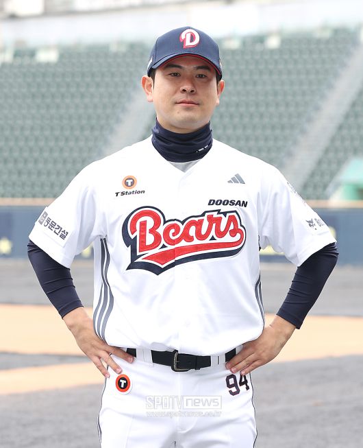 [스포티비뉴스=잠실, 곽혜미 기자] 2026 두산 창단기념식이 15일 오전 서울 송파구 잠실야구장에서 열렸다. 두산 윤명준 코치가 기념 촬영을 하고 있다. <저작권자 ⓒ SPOTV NEWS. 무단전재 및 재배포 금지>