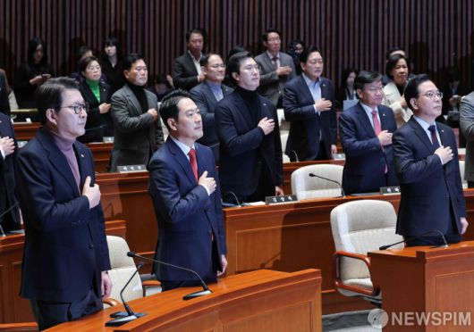 [서울=뉴스핌] 윤창빈 기자 = 장동혁 국민의힘 대표, 송언석 원내대표 등 소속 의원들이 15일 서울 여의도 국회에서 열린 의원총회에서 국민의례를 하고 있다. 2026.01.15 pangbin@newspim.com