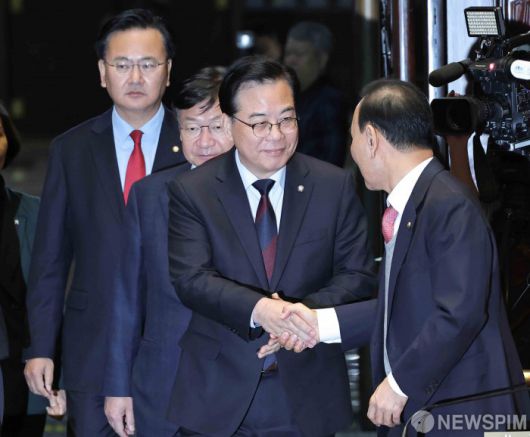 [서울=뉴스핌] 윤창빈 기자 = 송언석 국민의힘 원내대표가 15일 서울 여의도 국회에서 열린 의원총회에 참석하고 있다. 2026.01.15 pangbin@newspim.com
