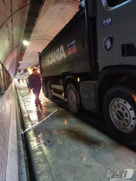 덤프트럭 주행 중 하부에서 흰 연기가 발생한 것을 보고 터널을 지나던 소방 관련 업체 직원들이 터널 내 비치된 옥내 소화전을 이용해 불을 껐다.