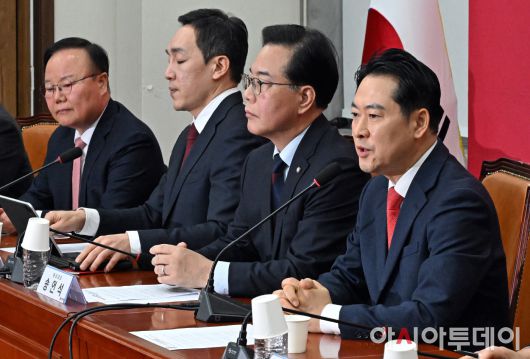 아시아투데이 송의주 기자 = 장동혁 국민의힘 대표(맨 오른쪽)가 15일 국회에서 열린 최고위원회의에서 발언을 하고 있다.
