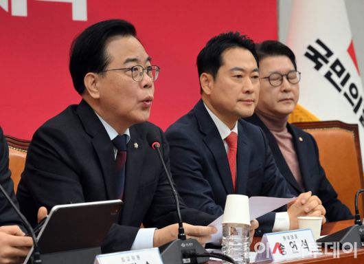 아시아투데이 송의주 기자 = 송언석 국민의힘 원내대표(맨 왼쪽)가 15일 국회에서 열린 최고위원회의에서 발언을 하고 있다.
