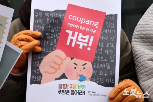 15일 서울 송파구 쿠팡 본사 앞에서 열린 쿠팡 쿠폰 거부 선언 노동계, 중소상인, 종교계, 정당, 소비자, 시민사회단체 공동 기자회견에서 참석자들이 5천원 할인쿠폰을 찢는 퍼포먼스를 하고 있다.진실은 노컷, 거짓은 칼컷저작권자 © CBS 노컷뉴스 무단전재 및 재배포 금지