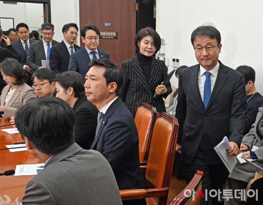 아시아투데이 송의주 기자 = 한병도 더불어민주당 원내대표와 지도부가 15일 국회에서 열린 정책조정회의에 참석하고 있다.