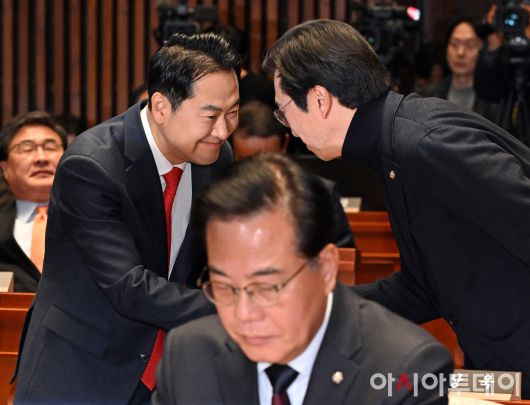 아시아투데이 송의주 기자 = 장동혁 국민의힘 대표(왼쪽)가 15일 국회에서 열린 의원총회에 참석하고 있다. 가운데는 송언석 원내대표.