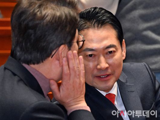 아시아투데이 송의주 기자 = 장동혁 국민의힘 대표(오른쪽)가 15일 국회에서 열린 의원총회에서 신동욱 최고위원과 대화하고 있다.