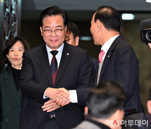 아시아투데이 송의주 기자 = 송언석 국민의힘 원내대표(왼쪽)가 15일 국회에서 열린 의원총회에 참석하고 있다.