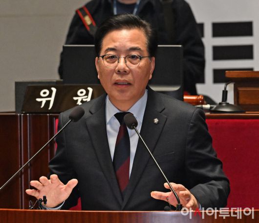 아시아투데이 송의주 기자 = 송언석 국민의힘 원내대표가 15일 국회에서 열린 의원총회에서 발언을 하고 있다.