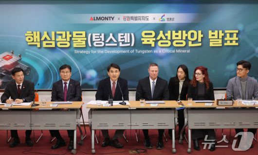 (강원=뉴스1) 이종재 기자 = 김진태 강원도지사는 15일 ㈜알몬티 인더스트리 최고운영책임자(COO)인 스티븐 알렌(Steven Allen), 최명서 영월군수 등과 함께 영월 상동 텅스텐 광산을 중심으로 한 핵심 광물(텅스텐) 육성 방안을 발표했다.