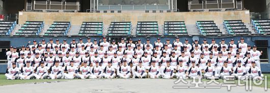 [스포츠투데이 권광일 기자] 두산 베어스 선수단이 15일 서울 잠실야구장에서 열린 두산 베어스 창단 기념식 및 시무식 행사를 마치고 기념촬영을 하고 있다. 2026.01.15.