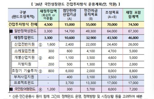 이같이 조성된 간접투자용 자금은 크게 ▲ 산업전반지원(1천600억원) ▲ 스케일업·개별산업·지방지원(900억원) ▲ 초장기기술투자(800억원) 등 '일반정책성펀드'와 1천200억원 규모의 '국민참여형펀드'로 구분돼 운용된다.