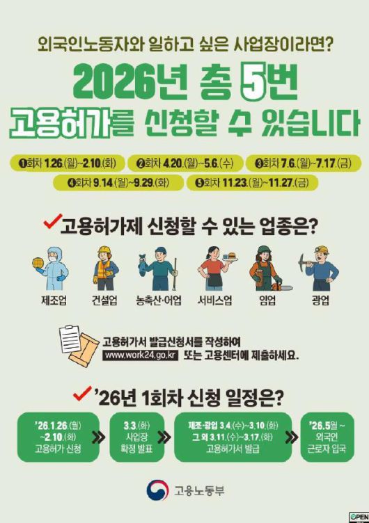 한편 외국인노동자 고용허가 신청일정은 1월과 4월, 7·9·11월 등 5차례로 나눠 신청받을 예정이다.