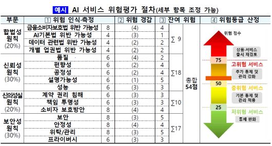 위험평가는 금융 AI 7대 원칙 가운데 합법성, 신뢰성, 신의성실, 보안성 등 정량적 요소를 중심으로 설계된다. AI 활용 전 단계에서 관련 법규를 준수하고, 신뢰할 수 있는 데이터와 모델을 사용해야 하며, 금융소비자의 이익을 최우선으로 고려하고, 보안 기준과 점검·개선 체계를 갖춰야 한다는 원칙이 평가 항목에 반영된다.