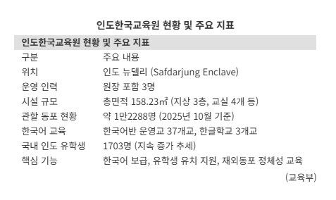 이번에 개원한 인도한국교육원은 재외국민의 교육활동 지원과 양국 간 교육 협력 강화를 목적으로 한다. 인도는 세계 인구 1위(약 14억7000만명) 국가로, 2015년부터 한국과 '특별 전략적 동반자 관계'를 맺고 있다. 교육부는 지난해 8월 발표한 '유학생 교육경쟁력 제고 방안'에 따라 전략적으로 유학생 유치가 필요한 인도에 공적 플랫폼을 구축했다.