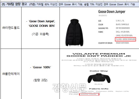 공정위 조사 결과, 이랜드월드는 거위털이 30% 정도만 사용돼 제품 기준 함량에 크게 못 미침에도 구스다운 제품이라고 거짓 광고했다. 볼렌테제이 등 3개 업체는 오리털 등 다른 조류의 털이 섞였는데도 거위털만 사용한 것처럼 속이기도 했다.