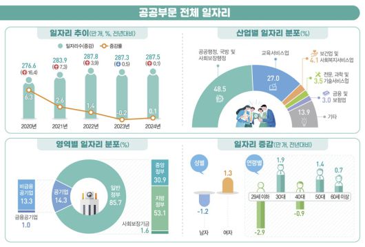 영역별로 일반정부 중 지방정부는 152만7000개로 8000개 늘었으나, 중앙정부는 88만9000개로 5000개 줄었다. 사회보장기금은 4만7000개로 전년과 같았다. 공기업 중에선 비금융공기업 일자리가 38만4000개로 3000개 감소했다. 금융공기업 일자리는 2만8000개로 전년과 같았다.